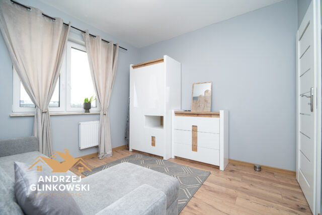 Sypialnia – przytulna, ustawna sypialnia zapewnia spokojną przestrzeń do odpoczynku. Pomieszczenie oferuje miejsce na łóżko oraz szafę, co pozwala na wygodne przechowywanie rzeczy i stworzenie komfortowej strefy prywatnej.