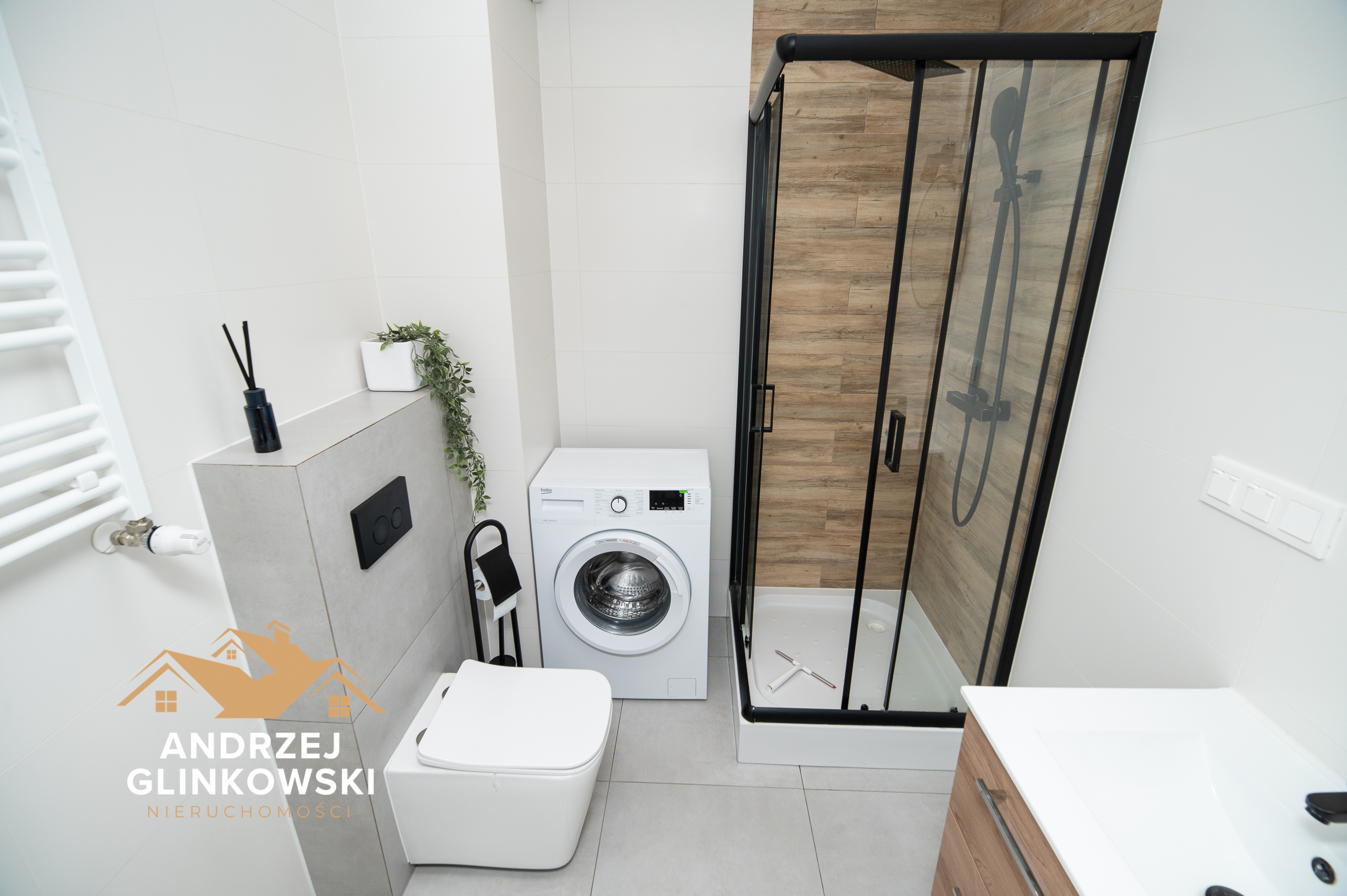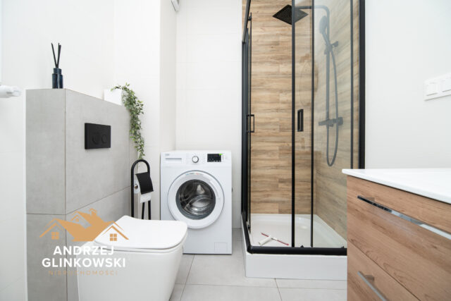 Łazienka z WC i prysznicem – nowoczesna łazienka została wykończona w estetycznym stylu. Wyposażona jest w kabiny prysznicową, toaletę, umywalkę z szafką oraz miejsce na pralkę, co zapewnia funkcjonalność i wygodę użytkowania.