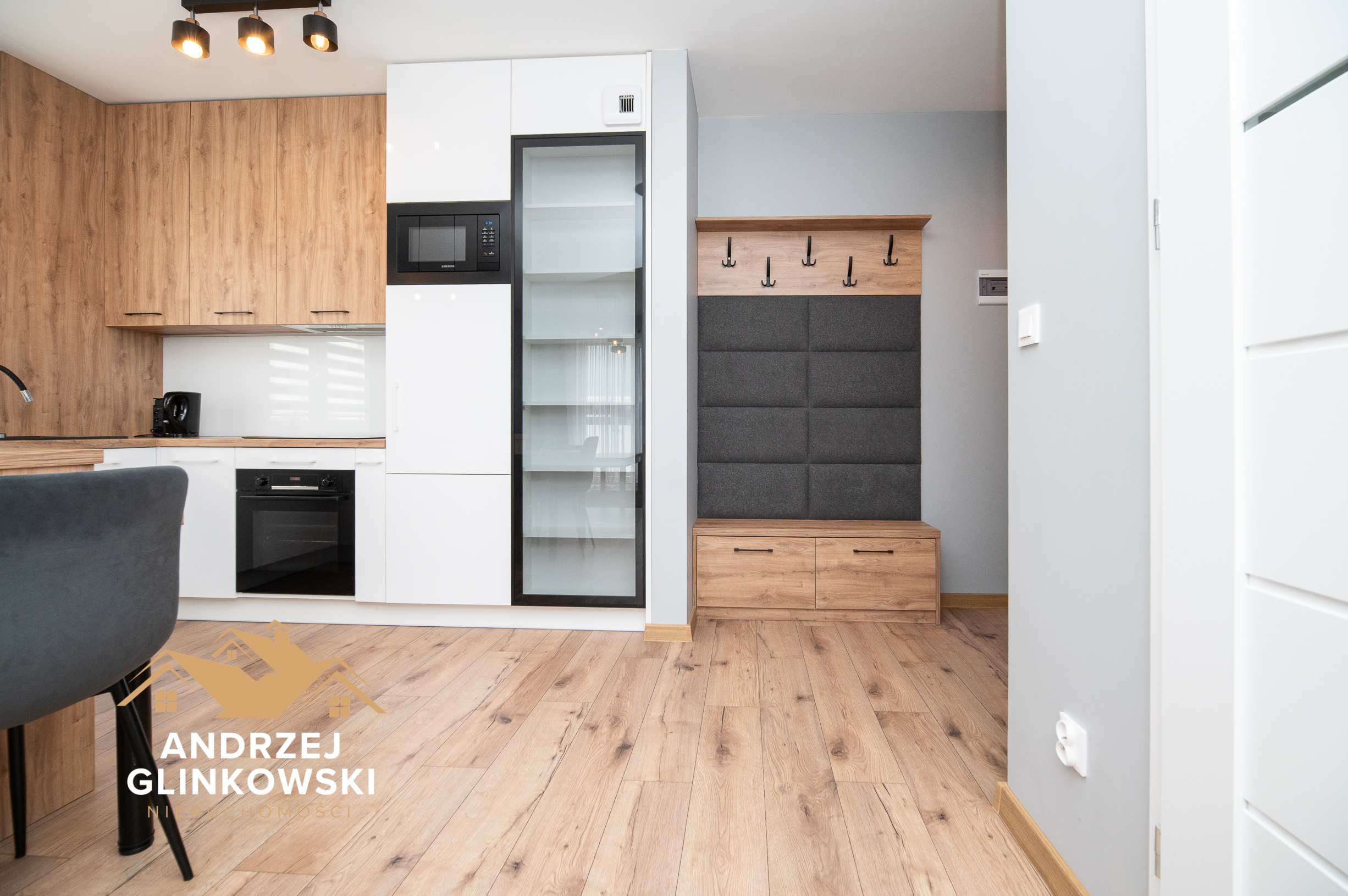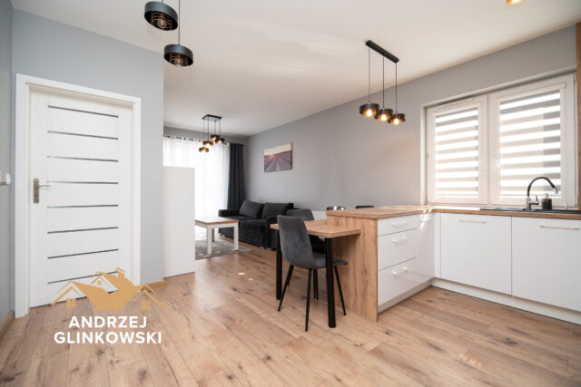Salon z aneksem kuchennym – przestronny i jasny salon stanowi serce mieszkania. Strefa wypoczynkowa zapewnia komfortowe miejsce do relaksu, a duże okna wpuszczają dużo naturalnego światła. Aneks kuchenny jest nowoczesny i funkcjonalnie zaprojektowany – wyposażony w zabudowę meblową oraz miejsce na sprzęt AGD, dzięki czemu codzienne przygotowywanie posiłków jest wygodne i przyjemne.