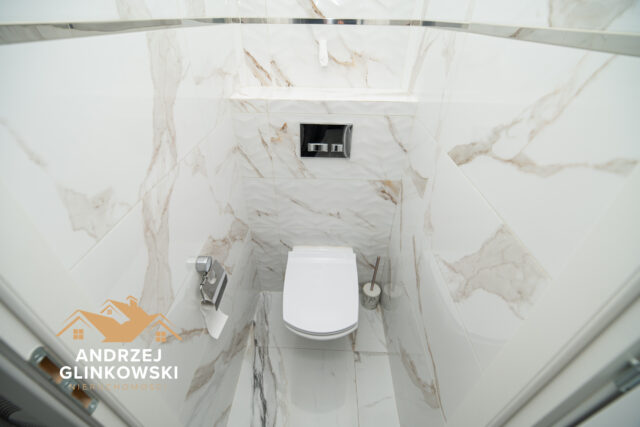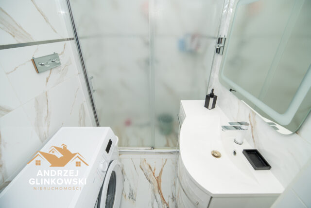 Łazienka z WC – wykończona nowoczesną glazurą, wyposażona w kabinę prysznicową, umywalkę z szafką, WC oraz nową armaturę.