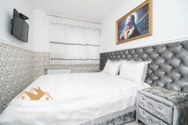 Sypialnia z wyjściem do garderoby – przytulna przestrzeń do wypoczynku z wygodnym łóżkiem, szafkami nocnymi ; z sypialni przejście do oddzielnej garderoby o powierzchni 5 m², idealnej do przechowywania ubrań i akcesoriów.