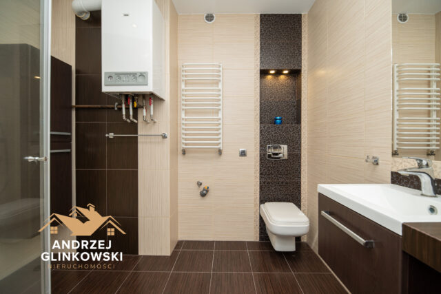 Nowoczesna łazienka z prysznicem – elegancko wykończona, z wysokiej jakości armaturą i funkcjonalnym układem.