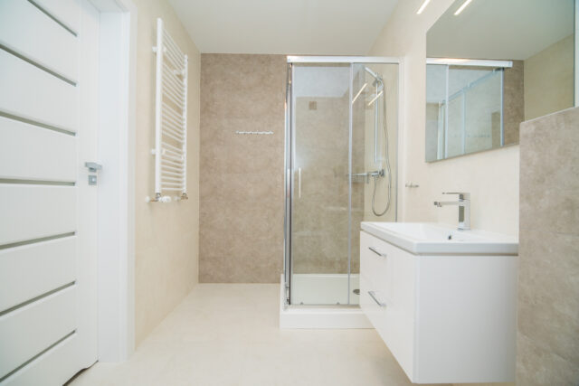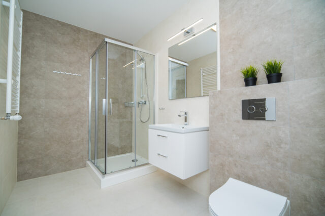 Łazienka z WC – urządzona w nowoczesnym stylu, z estetycznym prysznicem, funkcjonalna i komfortowa w codziennym użytkowaniu.