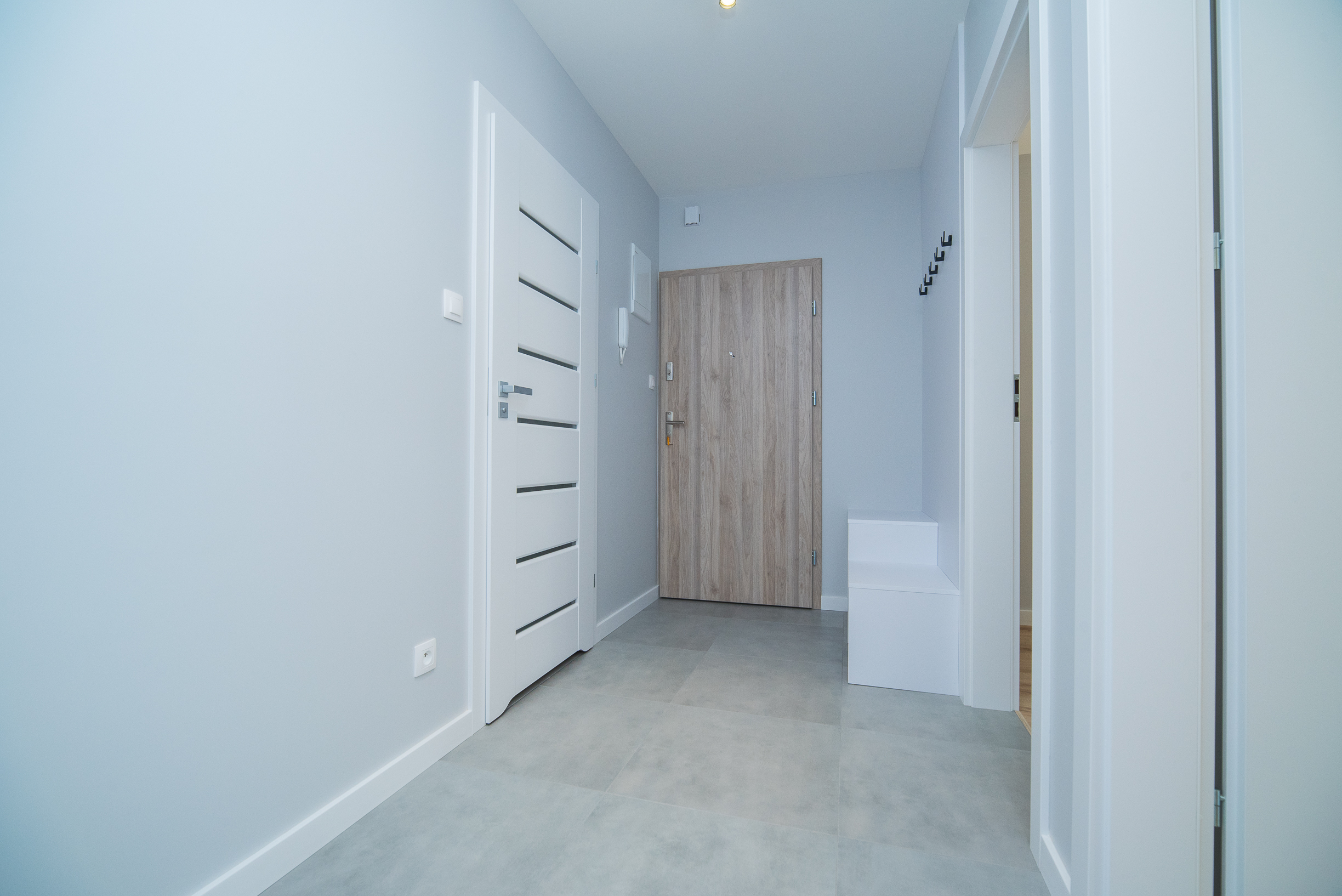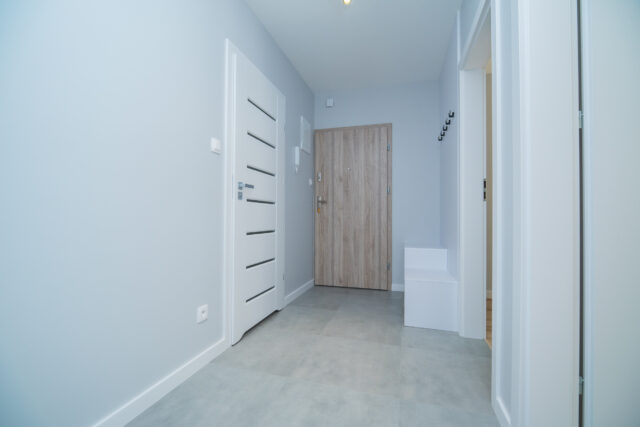 Przedpokój – wyposażony w praktyczny wieszak oraz szafkę na buty, zapewniający wygodną i uporządkowaną przestrzeń wejściową.