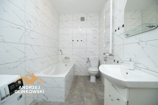 Łazienka z WC – Łazienka wyposażona w wannę, umywalkę oraz toaletę, co zapewnia wygodę w codziennym użytkowaniu.